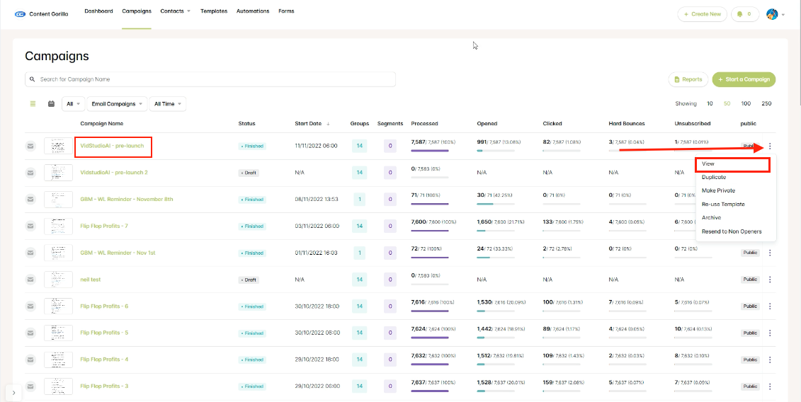 Step 3: From the Campaigns page, you can see all of the campaigns you have previously sent. Click on the three dots found at on the right side of the campaign you are interested in.