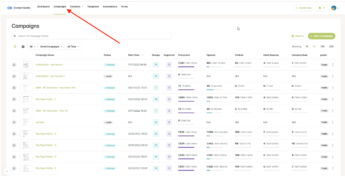 Step 2: Once logged in to the MAILVIO control panel, click the "CAMPAIGNS " link towards the top of the page.