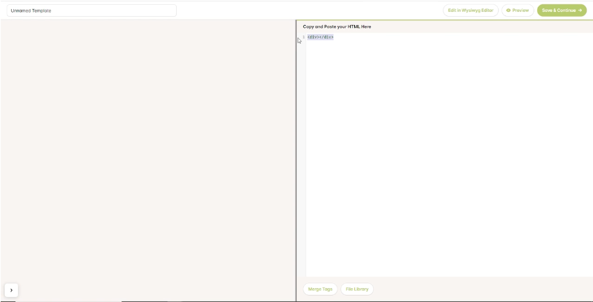 Step 5: After a few seconds, the Code Editor will load. The page is split into two sections. The large area on the left shows the final result of your HTML, the right-hand side enables you to paste your HTML, make changes, etc.