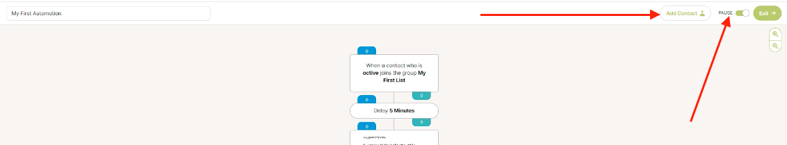 Step 9: Once activated, you will have the option to Add Contacts and Pause the workflow.