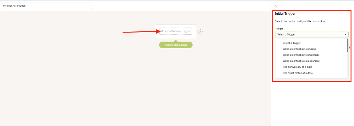 Step 6: Set a trigger by clicking on Define a Workflow Trigger and selecting a trigger from the Initial Trigger list. Take note, multiple triggers can be added.
