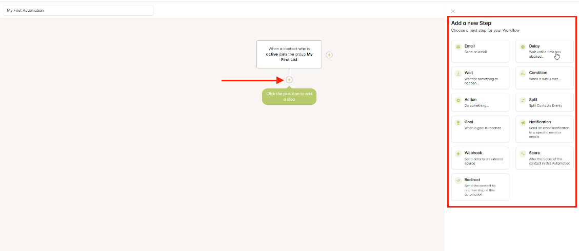 Step 7: Click on the + icon to add a new step. Choose from the listed options and don't forget to hit save. Feel free to add steps in between actions by clicking on the + icon.